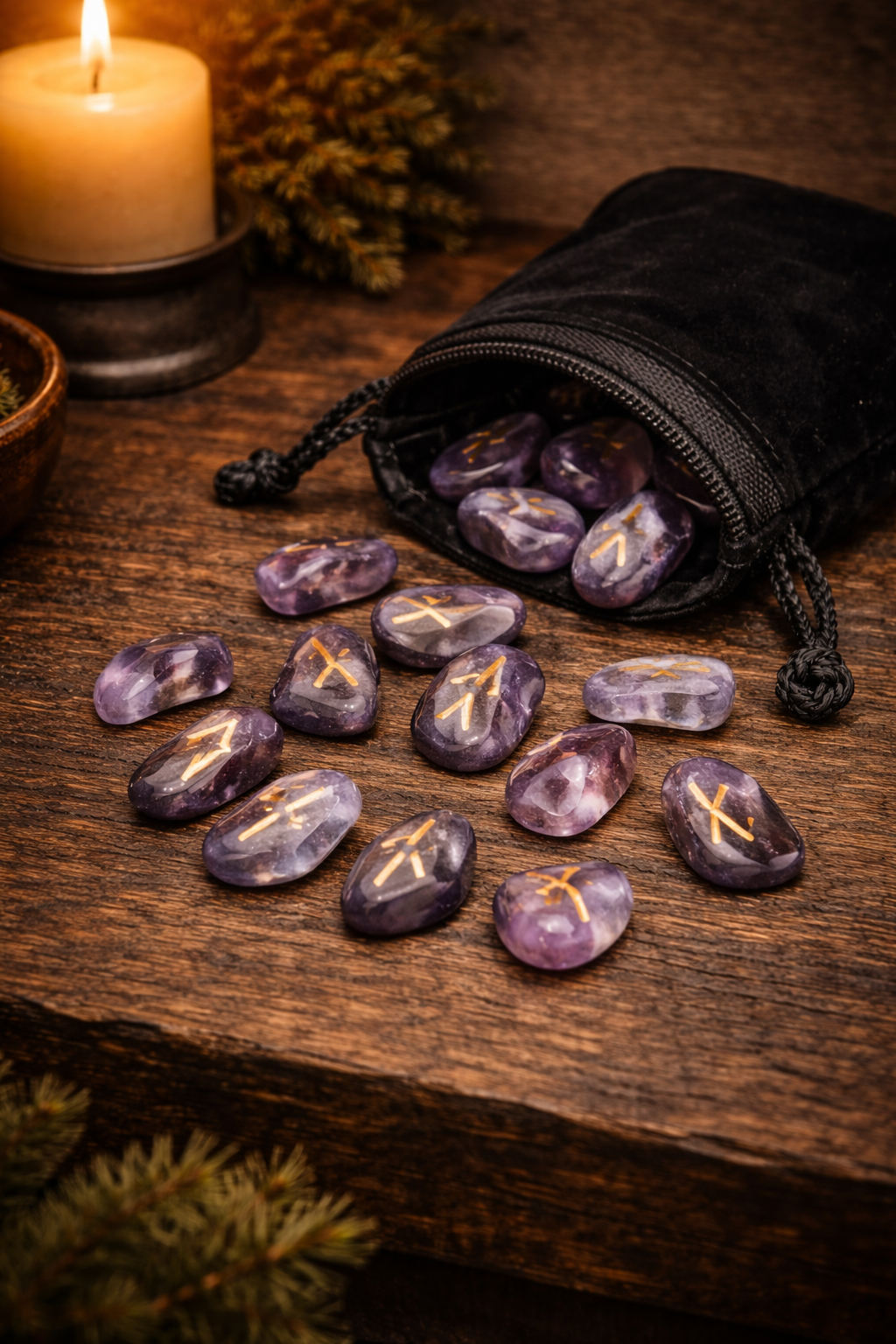 Wooden rune sets tend to feel the most grounded. They sit naturally on a wooden altar surface and age well over time. Stone rune sets feel heavier and more permanent. Both are valid choices.