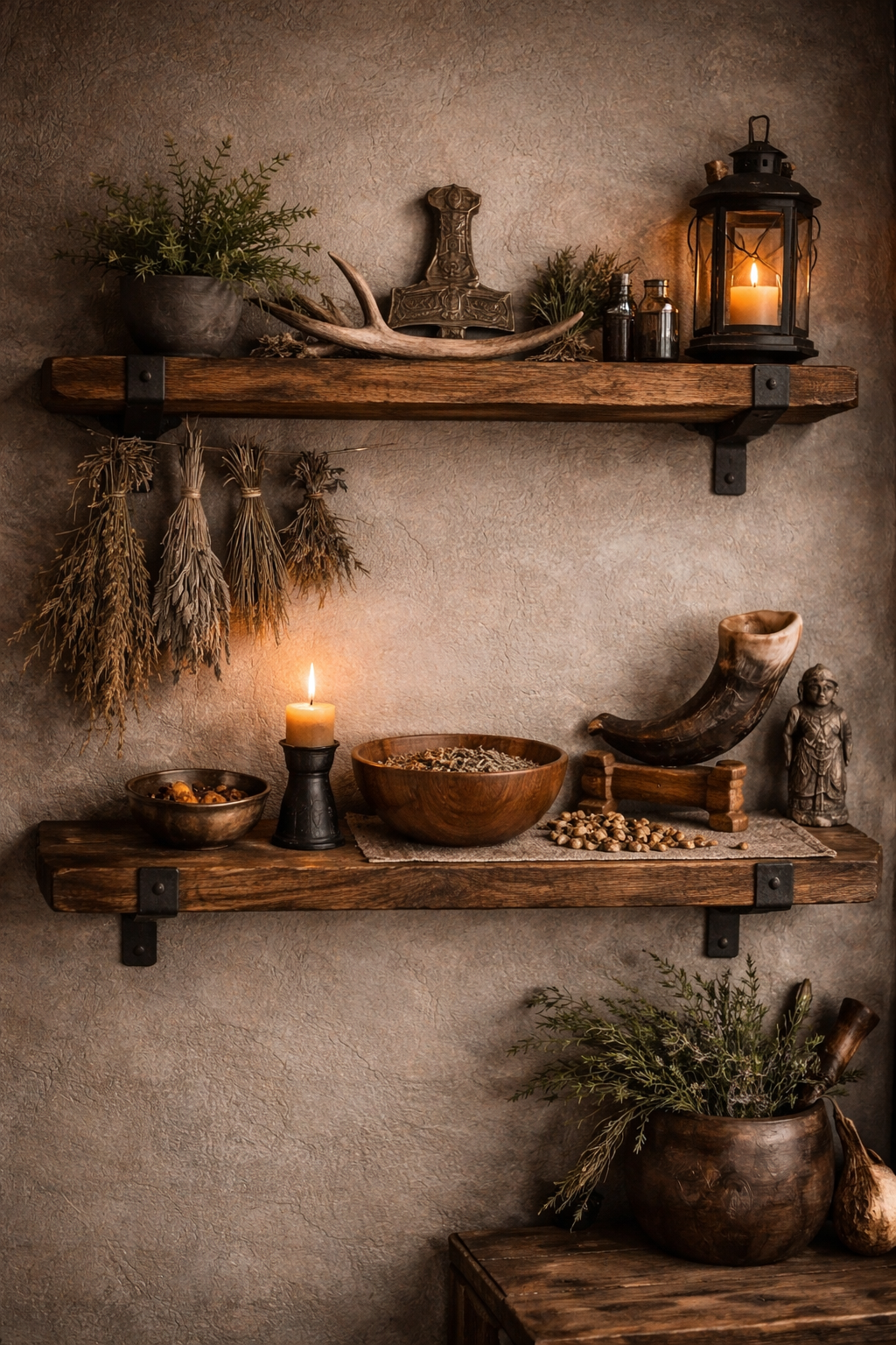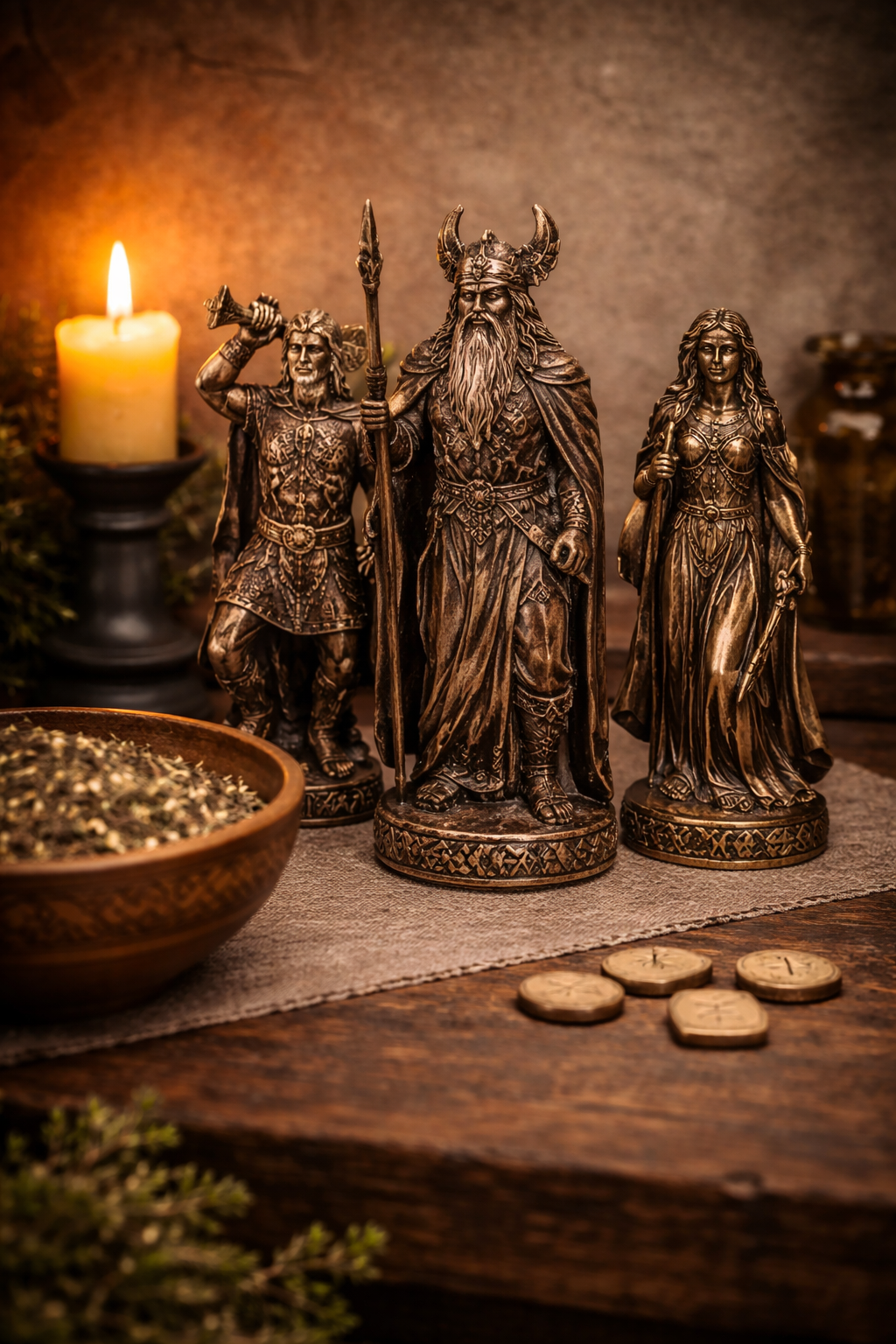 If you do choose to include a representation, keep it simple. Solid materials feel more grounded than lightweight resin figures. Wood, stone, or dark metal tend to sit more naturally on a Norse altar.