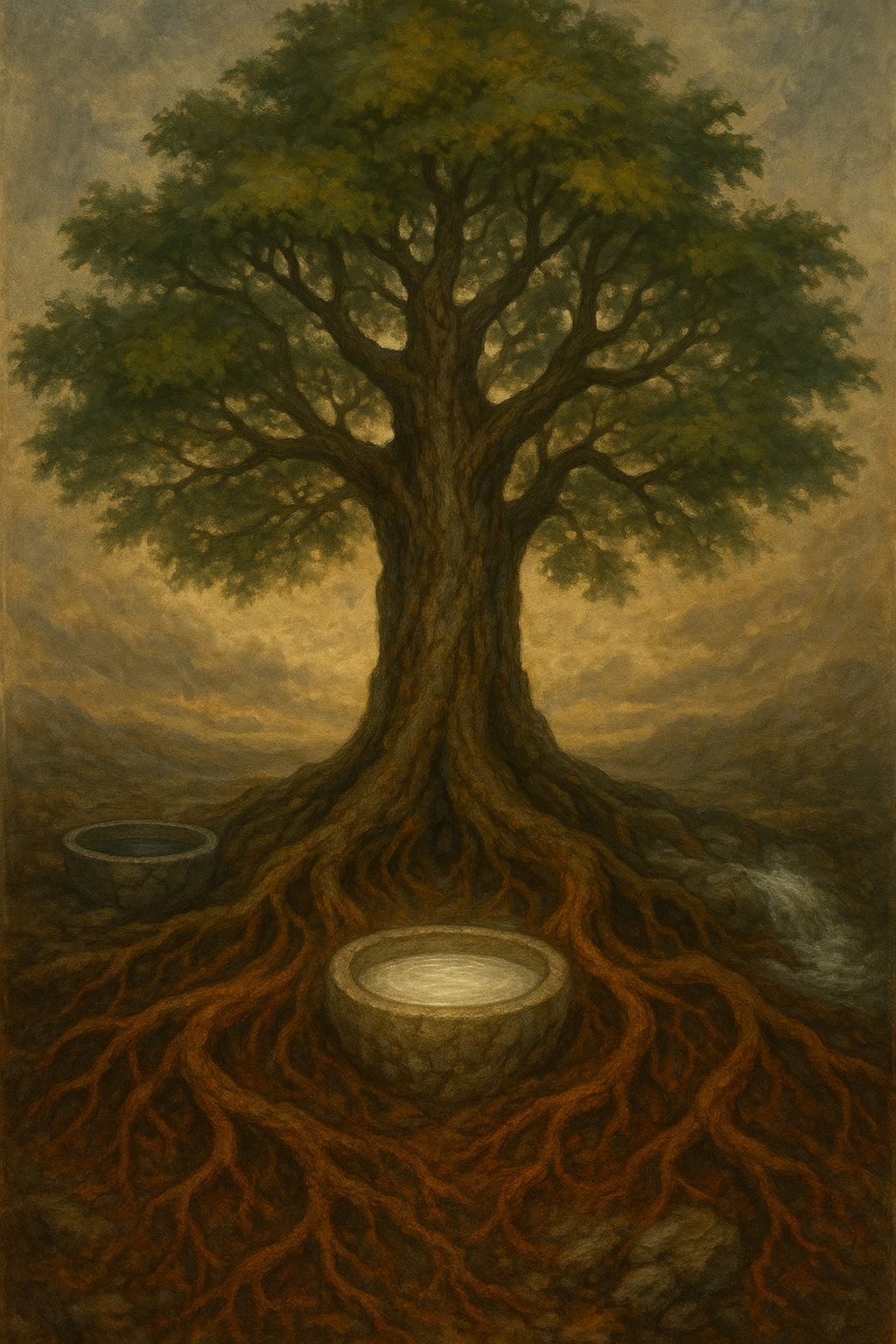When these three roots work together, a very specific alignment emerges. You feel rooted without being heavy, alert without tension, receptive without becoming porous, and aligned without rigidness. This is the posture the sagas gesture toward when the völva sits upon the high seat, when Odin hangs from the Tree, and when the gods meet at the Well of Fate. It is the quiet act of placement - the sense that you are exactly where you should be, doing exactly what you are ready for, held between the worlds but not lost in them.